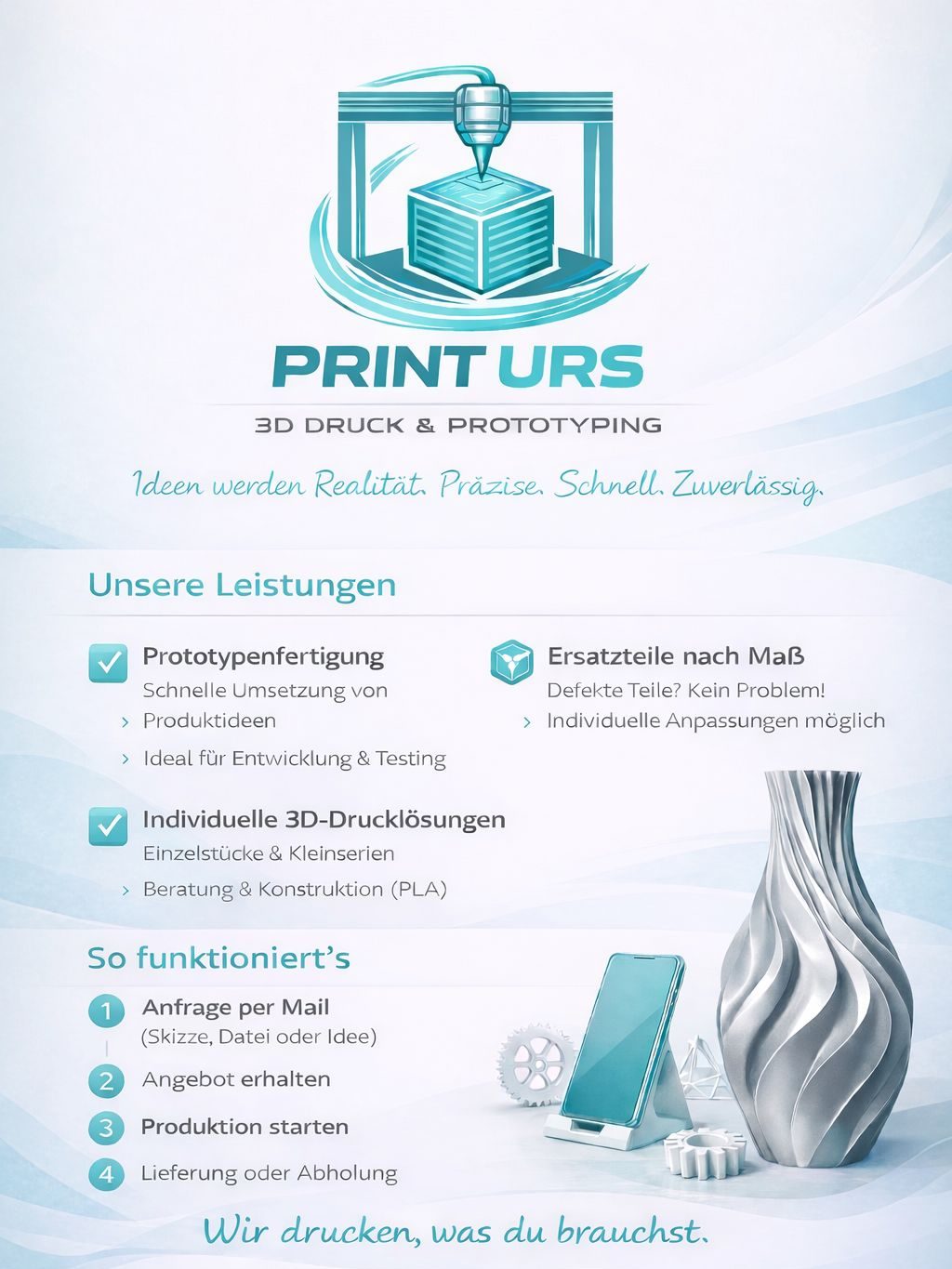 PrintURS wurde gegründet, um individuelle 3D-Drucklösungen für Privat- und Firmenkunden zu bieten. Unsere Mission ist es, jede Idee durch innovative Fertigungstechnologien und persönliche Beratung Wirklichkeit werden zu lassen. Wir legen Wert auf Flexibilität, Qualität und Nachhaltigkeit, um für jeden Kunden das passende Ergebnis zu erreichen.